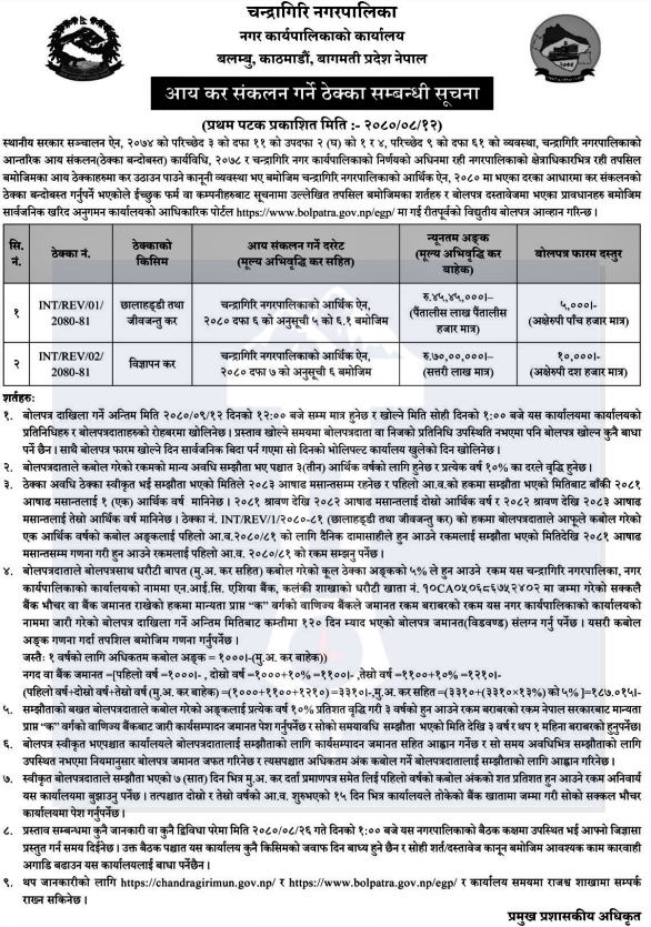 चन्द्रागिरि नगरले विज्ञापन कर संकलनका लागि खुलायो ठेक्का, न्यूनतम कबोल रकम ७० लाख रूपैयाँ