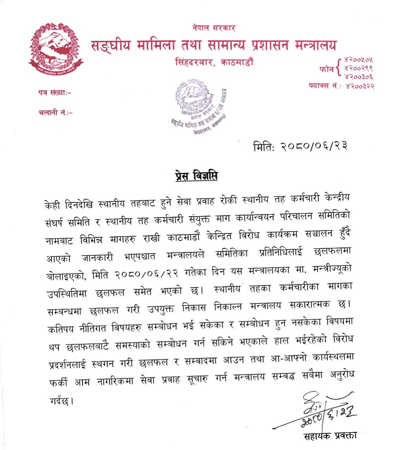 मन्त्रालयले सबै मन्त्रालय, आयोग, सचिवालय, कार्यालय तथा निकायलाई परिपत्र गरी आउँदो फागुन मसान्तसम्मका लागि सरुवा स्थगित गरिएको जानकारी गराएको छ । साथै परिपत्र कार्यान्वयनका लागि सम्बन्धित निकायलाई निर्देशनसमेत दिएको छ ।