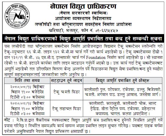 कालीमाटी पुल, परोपकार, टंकेश्वर, डल्लु, बिजेश्वरी, चमती, भगवान पाउ, डल्लु आवास, जनसेवा मार्ग, काराखुशी, कालीमाटी चोक, साल्ट ट्रेडिङ, सीता पेट्रोल पम्प, टंकेश्वर, महेन्द्ररत्न क्याम्पस, चागल, कलश अपार्टमेन्ट क्षेत्रमा विद्युत् आपूर्ति बन्द हुनेछ ।