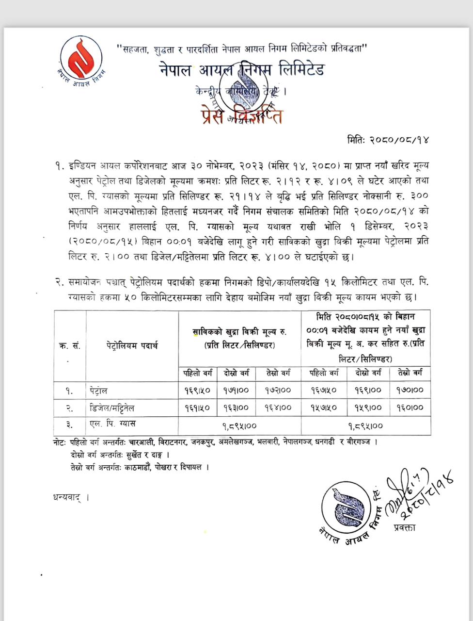 बिहीबार राति १२ बजेदेखि लागु हुने गरी निगमले पेट्रोलमा प्रतिलिटर दुई रुपैयाँ तथा डिजेल र मट्टीतेलमा प्रतिलिटर चार रुपैयाँ घटाएको छ ।