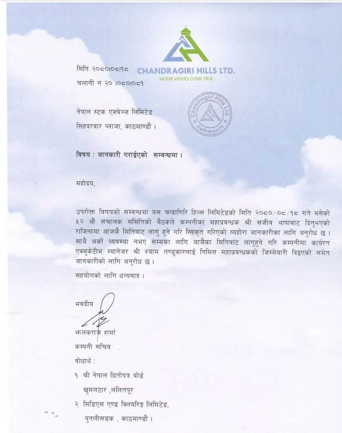 चन्द्रागिरि हिल्सका महाप्रबन्धक सन्जिव थापाले राजीनामा दिएपछि श्याम तण्डुकारलाई निमित्तको जिम्मेवारी