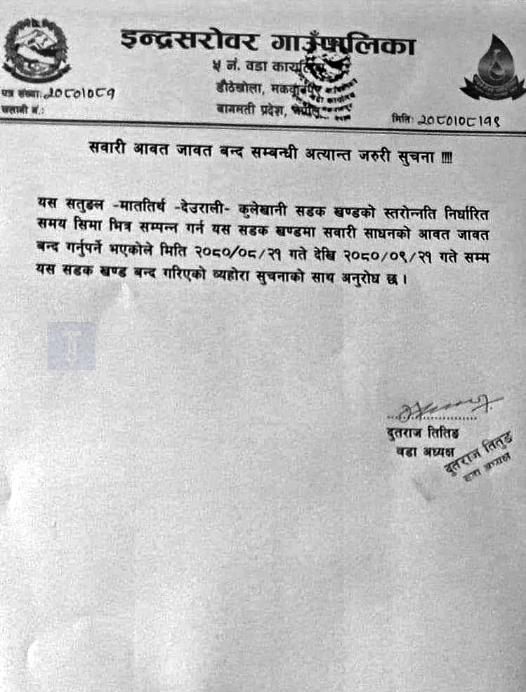 तोकिएको अवधिभित्रै सडकको स्तरोन्नति कार्य सम्पन्न गर्न सो अवधिभर उक्त सडकमा सवारी साधन सञ्चालन बन्द गर्न लागिएको इन्द्रसरोवर गाउँपालिका ५ का वडाध्यक्ष दुतराज तितिङले जानकारी दिए ।