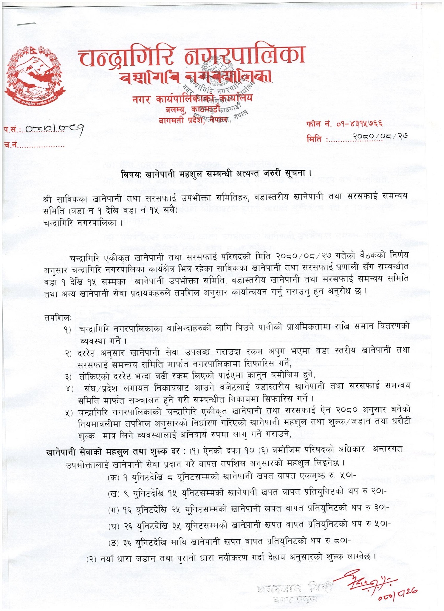 बुधबार जारी सूचना अनुसार चन्द्रागिरि एकीकृत खानेपानी तथा सरसफाई परिषद्को मंसिर २७ गतेको बैठकको निर्णय अनुसार अब नगरका सबै १५ वटै वडामा रहेका खानेपानी उपभोक्ता समिति, वडास्तरीय खानेपानी तथा सरसफाई समन्वय समिति तथा अन्य खानेपानी सेवा प्रदायकहरूले नगरले खानेपानी सेवा महशुल तथा शुल्क दर पालना गर्नुपर्ने जनाइएको छ ।