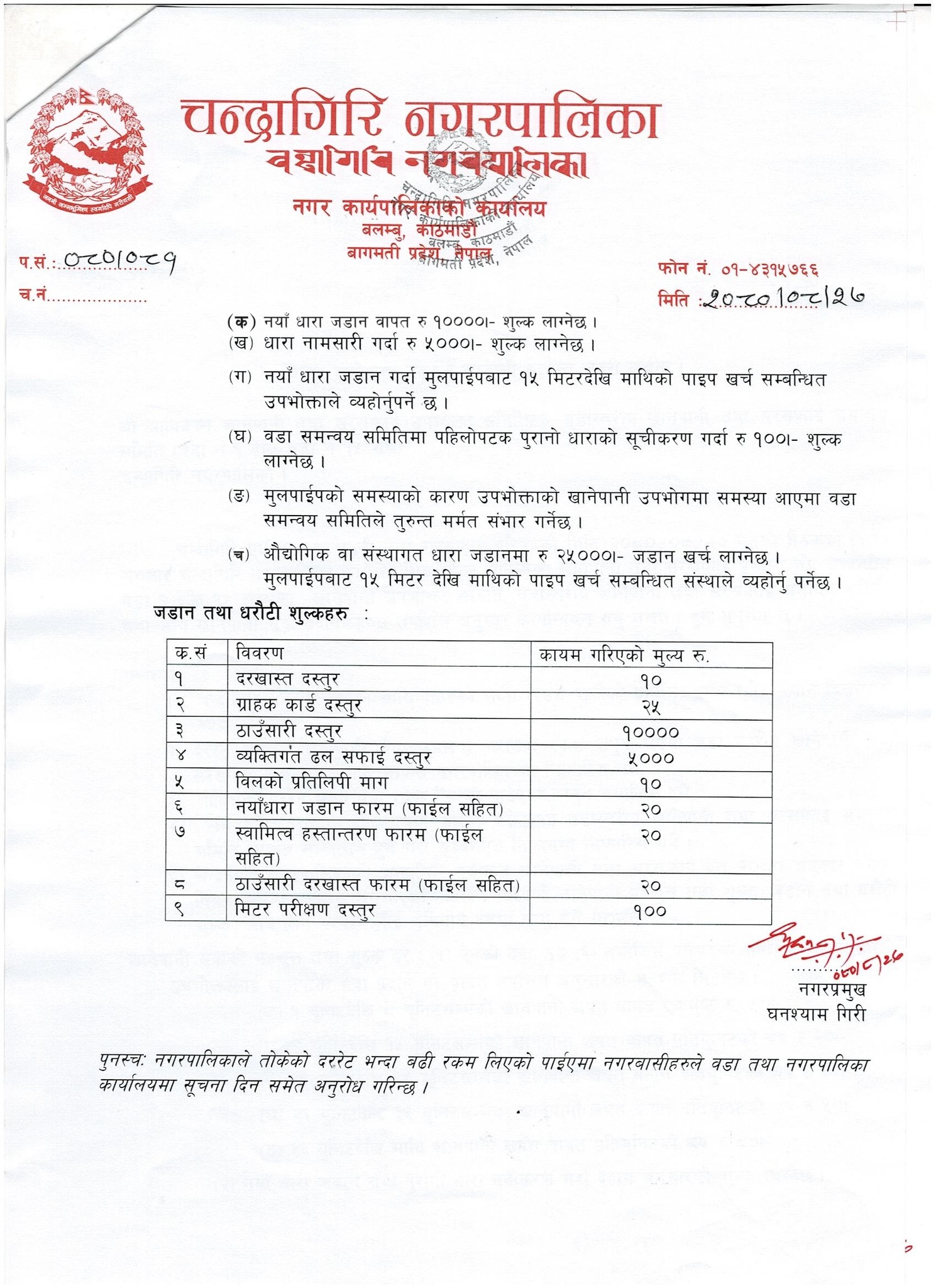 सूचना उल्लेख भएअनुसार अब चन्द्रागिरि नगरमा क्रियाशील खानेपानी सेवा प्रदायकहरूले खानेपानी सेवा उपलब्ध गराए बापत उपभोताहरूबाट १ देखी ८ यूनिट सम्म खानेपानी शुल्क बापत एकमुष्ठ ५० रूपैयाँ लिन पाउनेछन् । यसैगरी ९ देखी १५ यूनिटसम्म प्रतियूनिट थप २० रूपैयाँ, १६ देखी २५ यूनिटसम्म थप प्रतियूनिट ३० रूपैयाँ, २६ देखी ३५ यूनिटसम्म प्रतियूनिट थप ५० रूपैयाँ तथा ३६ यूनिटभन्दा माथिको खपतमा थप ८० रूपैयाँ लिन पाउनेछन् ।