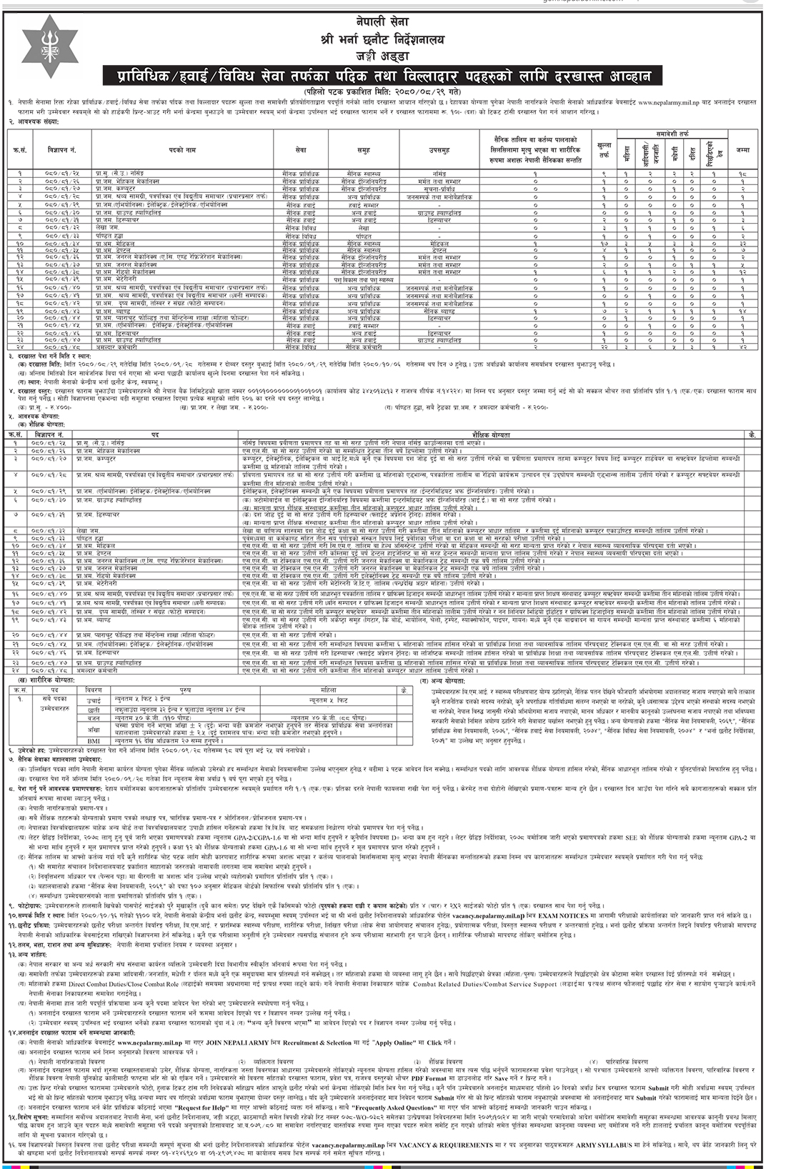 नेपाली सेनाले विभिन्न पदका लागि आवेदन माग गरेको छ । भर्ना छनोट निर्देशनालय जंगी अड्डाले प्राविधिक, हवाईसहित विविध सेवातर्फका पदिक तथा विल्लादार पदहरूमा दरखास्त माग गरेको हो ।