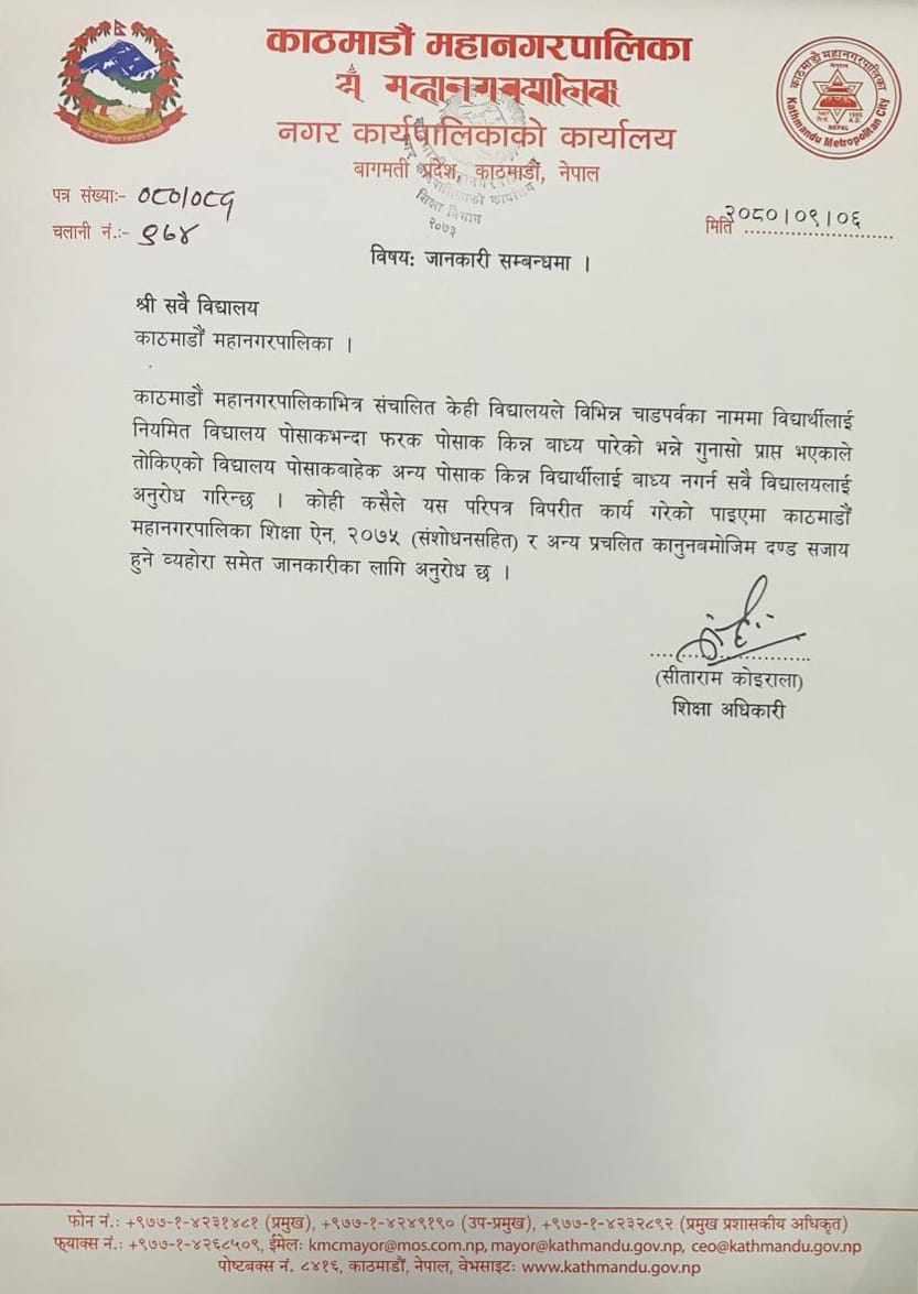 “काठमाडौं महानगरपालिकाभित्र सञ्चालित केही विद्यालयले विभिन्न चाडपर्वका नाममा विद्यार्थीलाई नियमित विद्यालय पोसाकभन्दा फरक पोसाक किन्न बाध्य पारेको भन्ने गुनासो प्राप्त भएकाले तोकिएको विद्यालय पोसाकबाहेक अन्य पोसाक किन्न विद्यार्थीलाई बाध्य नगर्न सबै विद्यालयलाई अनुरोध गरिन्छ,” परिपत्रमा लेखिएको छ, “कोही कसैले यस परिपत्रविपरीत कार्य गरेको पाइएमा काठमाडौं महानगरपालिका शिक्षा ऐन, २०७५ (संशोधनसहित) र अन्य प्रचलित कानुनबमोजिम दण्ड सजाय हुने व्यहोरा समेत जानकारीका लागि अनुरोध छ ।”