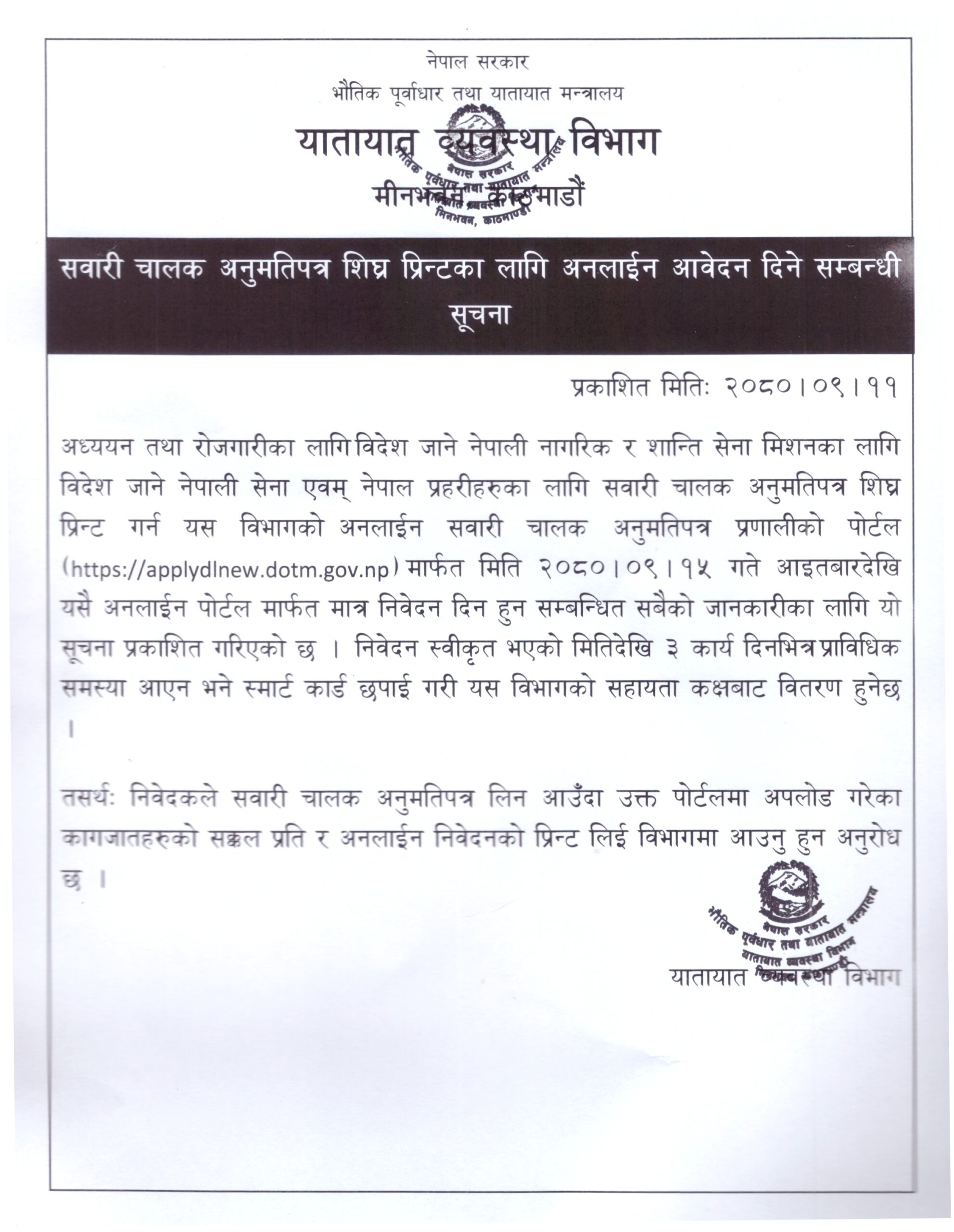 शिघ्र प्रिन्टका लागि विभागले आफ्नो अनलाइन लाइसेन्स प्रणालीको पोर्टल मार्फत् आवेदन दिन आग्रह गरेको छ।