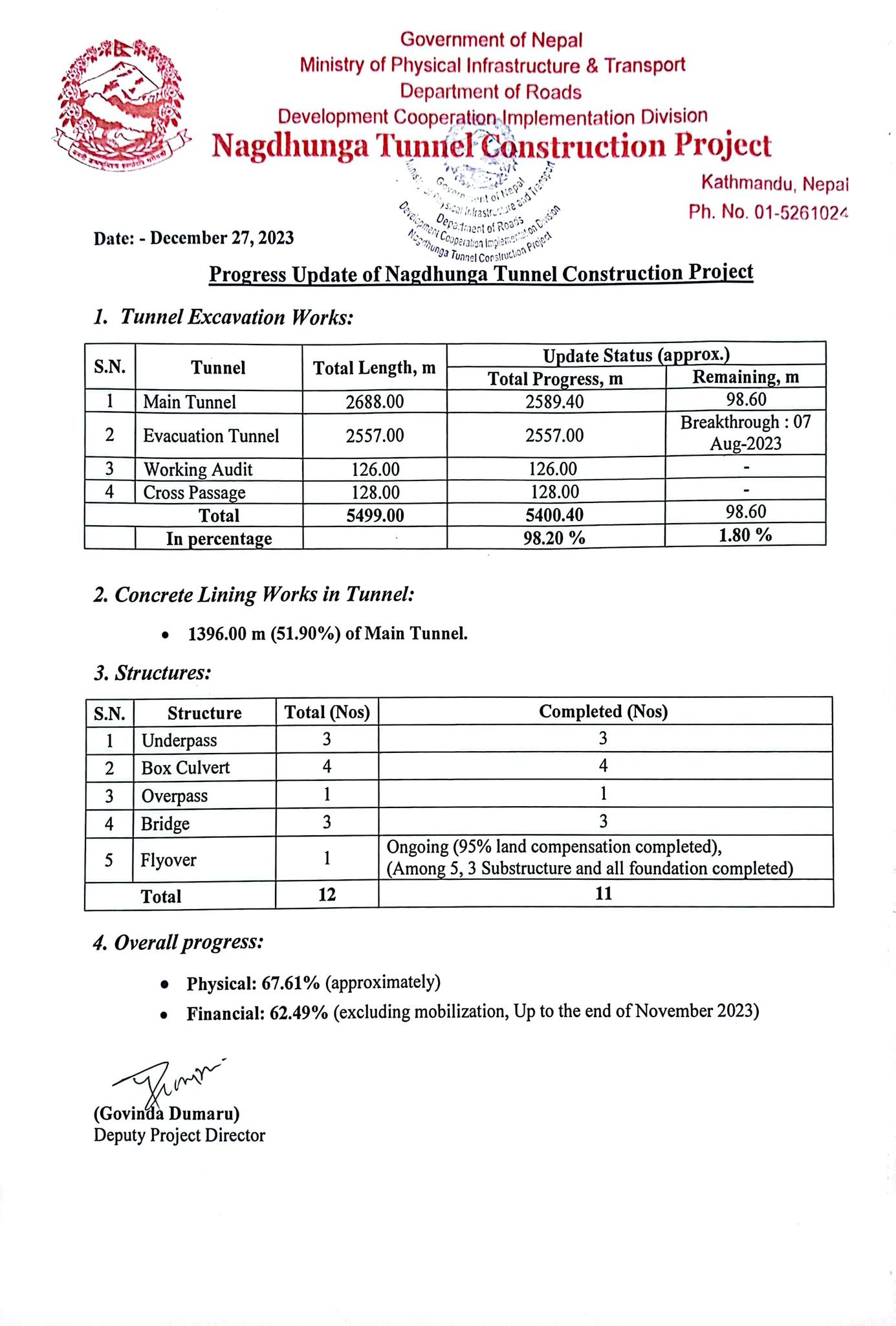 कुल २ हजार ६८८ मिटर लम्बाइ रहेको सुरुङको २ हजार ५८९.४० मिटर सुरुङ खनिइसकिएको आयोजनाका निमित्त आयोजना प्रमुख गोविन्द डुमारुले जानकारी दिएका छन् । उनका अनुसार आयोजनाको सुरुङतर्फको मात्र प्रगति अब ९८.२० प्रतिशत पुगेको छ ।