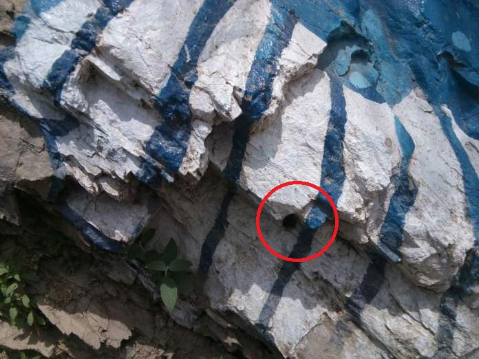 रातो घेरामा हालको साकुरा पार्क नजिकैको भीरमा भीमशमशेरको पालामा चट्टान फुटाउन डेटोनेटर राख्न पारिएको प्वाल ।
