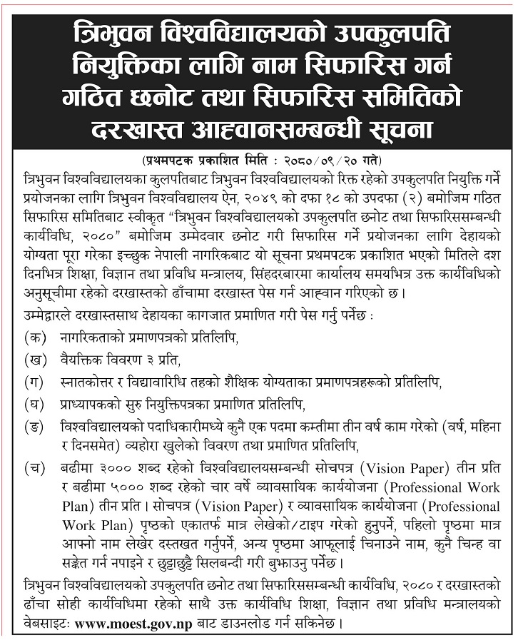 आज सार्वजनिक सूचनामा कुलपतिबाट रिक्त उपकुलपति नियुक्त गर्न त्रिभुवन विश्वविद्यालय ऐन २०४९ को दफा १८ को उपदफा (२) अनुसार गठित सिफारिस समितिबाट स्वीकृत कार्यविधि २०८० अनुसार योग्यता पुगेका इच्छुक नेपाली नागरिकबाट दश दिनभित्र दरखास्त पेस गर्न भनिएको छ ।