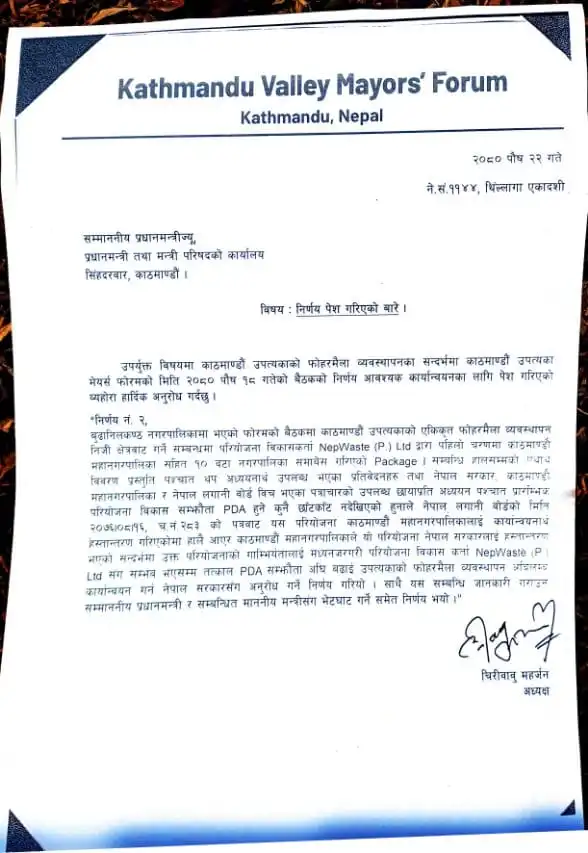 सोमबार सिंहदरबारमा काठमाडौं भ्याली मेयर्स फोरमले काठमाडौं उपत्यकाको फोहोर व्यवस्थापनका लागि २० जुन २०११ मा भएको नेपवेस्टसँगको सम्झौता कार्यान्वयन गर्न प्रधानमन्त्री पुष्पकमल दाहाललाई बुझाएको ज्ञापनपत्र ग्रहण गरेपछि सो प्रतिबद्धता जनाएको ललितपुर महानगरपालिका प्रमुख एवं फोरमका अध्यक्ष चिरीबाबु महर्जनले जानकारी दिए।