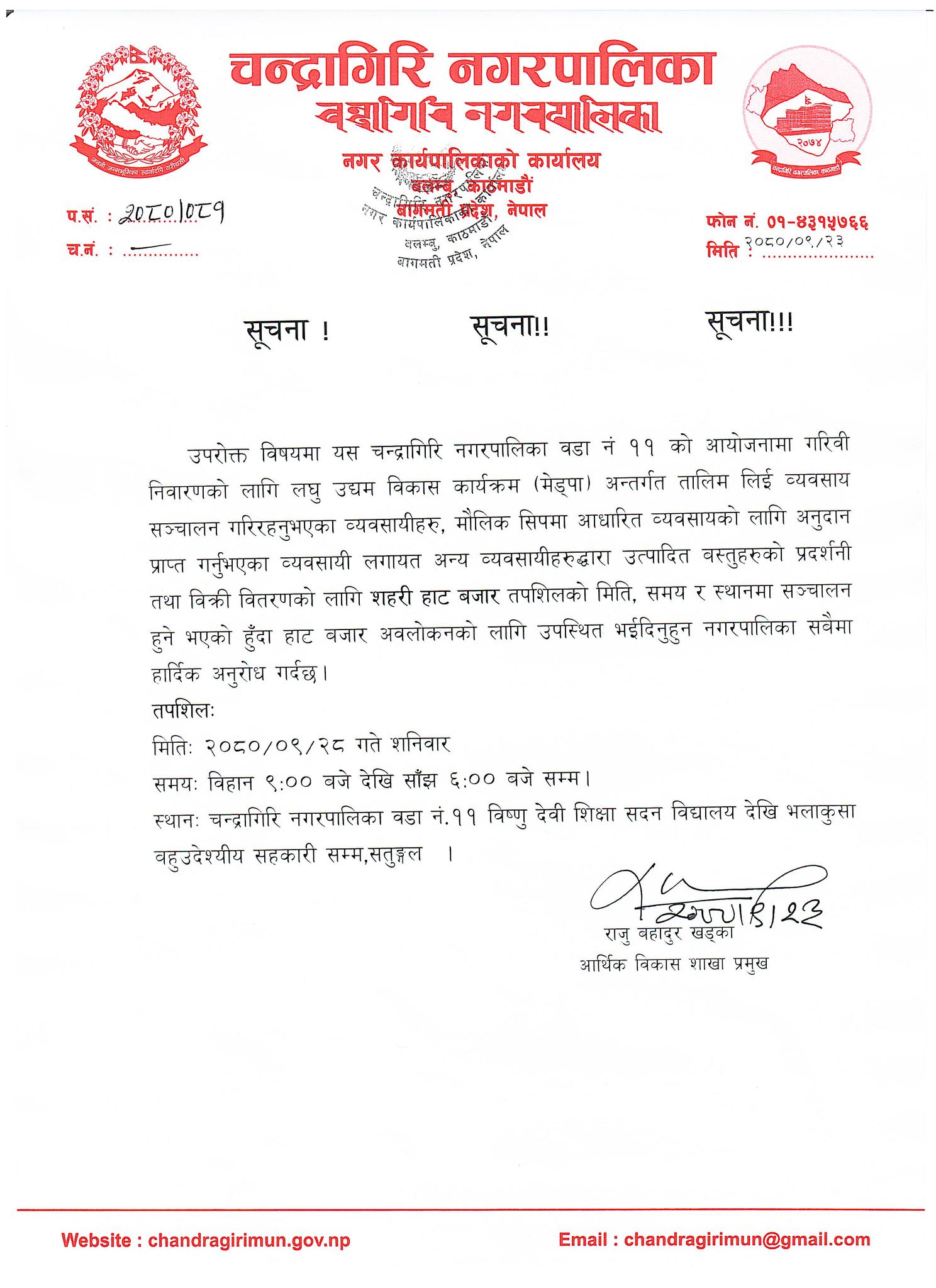 चन्द्रागिरि वडा नं. ११ ले आयोजना गर्ने सो हाटबजारमा गरिबी निवारणका लागि लघु उद्यम विकास कार्यक्रम मेड्पा अन्तर्गत तालिम लिई व्यवसाय सञ्चालन गरिरहेका व्यवसायीहरू, माैलिक सिपमा आधारित व्यवसायको लागि अनुदान प्राप्त गरेका व्यवसायी लगायत अन्य व्यवसायीहरूद्वारा उत्पादित वस्तुहरूको विक्री तथा प्रदर्शनी हुने बताइएको छ ।