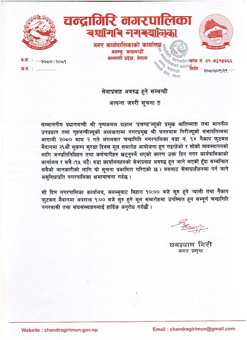 यसकारण आज चन्द्रागिरि नगरपालिका तथा वडा कार्यालयहरूबाट प्रवाह हुने सेवा अवरुद्ध हुने