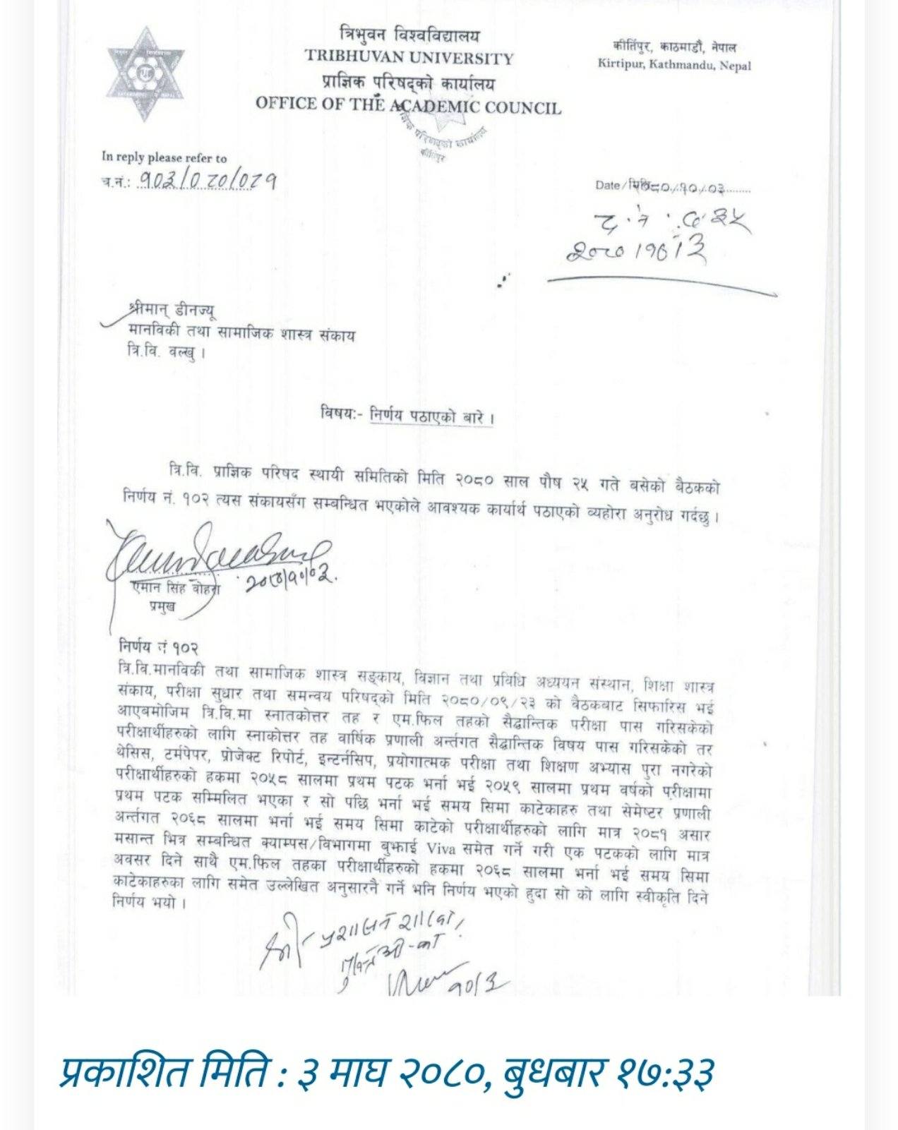 त्रिवि प्राज्ञिक परिषद्को पुस २५ गते बसेको बैठकले २०८१ असार मसान्तसम्ममा बुझाउन भनेको हो ।
