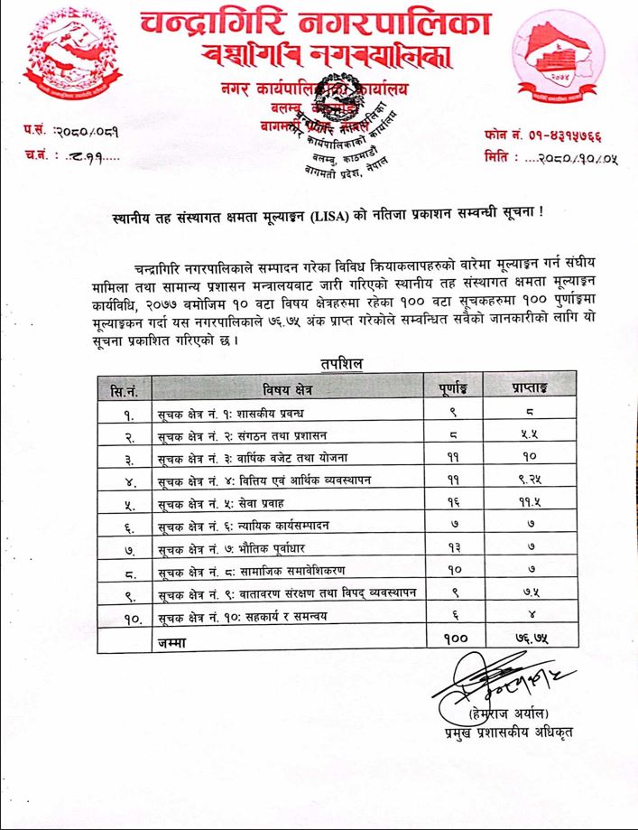 संघीय मामिला तथा प्रशासन मन्त्रालयबाट जारी भएको स्थानीय तह संस्थागत क्षमता मूल्याङ्कन कार्यविधि, २०७७ बमोजिम १० वटा विषय क्षेत्रहरुमा रहेका विभिन्न सुचकहरुमा एक सय पूर्णाङ्क आधार मान्दै गरिएको मूल्याङ्कनमा चन्द्रागिरि नगरपालिकाले ७६.७५ अंक प्राप्त गरेको हो ।