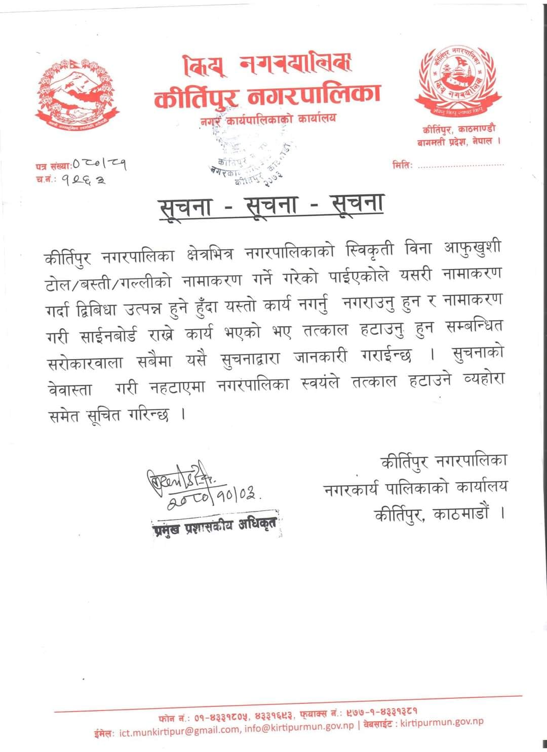 कीर्तिपुर नगरपालिकाले टोल बस्तीको नामाकरण आफुखुसी राख्न थालेपछि चेतावनीयुक्त सूचना जारी गरेको छ ।