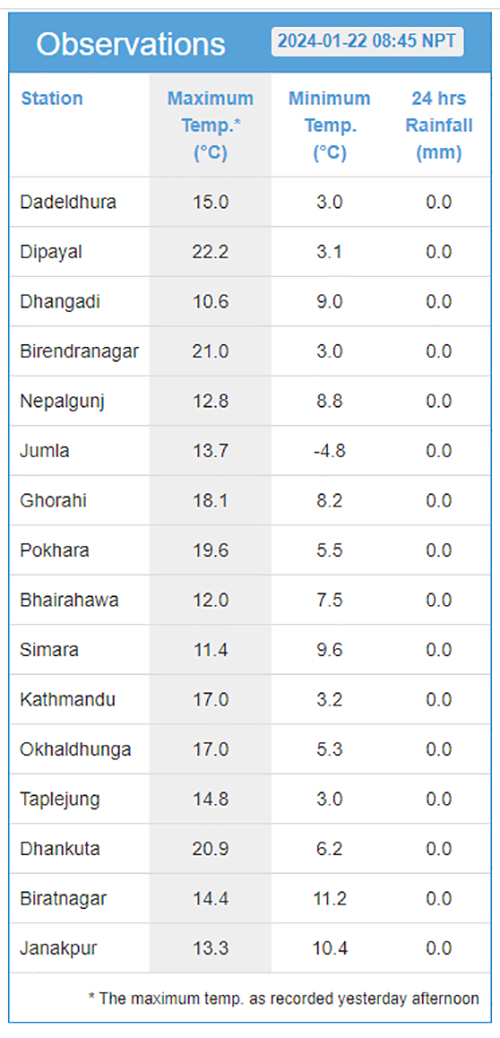 यो वर्ष यसअघि काठमाडौंको कम तापक्रम गएको पुस २० गते मापन गरिएको थियो । पुस २० गते (शुक्रबार) बिहान पौने ९ बजे काठमाडौंको न्यूनतम तापक्रम ३.५ डिग्री सेल्सियस थियो ।