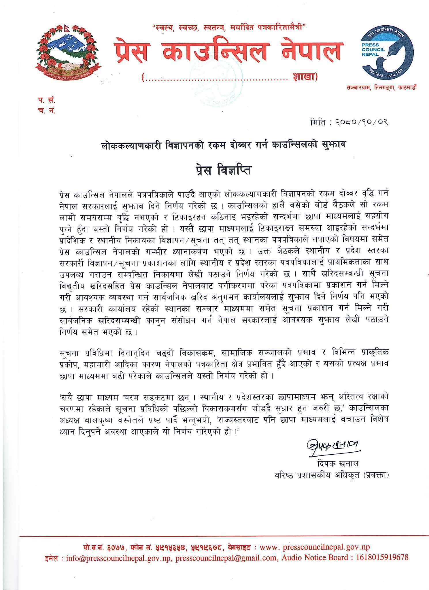 काउन्सिलका वरिष्ठ प्रशासकीय अधिकृत दीपक खनालले मंगलबार जारी गरेको विज्ञप्तिमा छापामाध्यमलाई टिकाइराख्न समस्या आइरहेको सन्दर्भमा प्रादेशिक र स्थानीय निकायका विज्ञापन/सूचना तत्–तत् स्थानका पत्रपत्रिकाले नपाएको विषयमा समेत काउन्सिलको गम्भीर ध्यानाकर्षण भएको उल्लेख छ ।