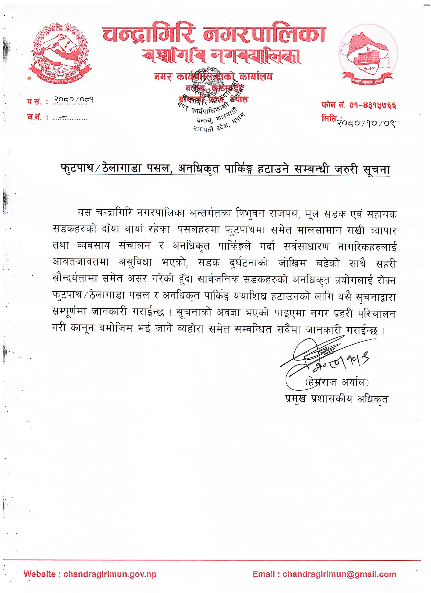 मंगलबार एक सूचना जारी गर्दै नगरले सडकका दायाँबायाँ मालसामन राखेर व्यापार व्यवसाय संचालन गरिँदा तथा अनधिकृत पार्किङले सर्वसाधारण नागरिकहरूलाई आवातजावतमा असुविधा भएको, सडक दुर्घटनाको जोखिम बढेको साथै शहरी साैन्दर्यतामा समेत ह्रास आएको भन्दै नगरपालिका क्षेत्रभित्र पर्ने त्रिभुवन राजपथ तथा मूल एवं सहायक सडकका दायाँबायाँ तथा सडकका फुटपाथमा सञ्चालन गरिएका पसल एवं ठेलागाडाहरू हटाउन सार्वजनिक आह्वान गरेको छ।
