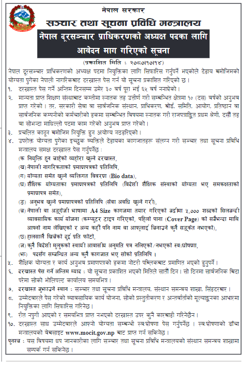 नेपाल दूरसञ्चार प्राधिकरणले अध्यक्ष पदका लागि आवेदन माग गरेको छ।