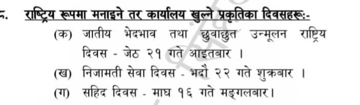 यसै गरी राष्ट्रिय रूपमा मनाइने तर कार्यालय खुल्ने प्रकृतिका दिवसहरूमा जातीय भेदभाव तथा छुवाछुत उन्मुलन राष्ट्रिय दिवस जेठ १६ गते र निजामती सेवा दिवस भदौ २२ गते रहेका छन् ।