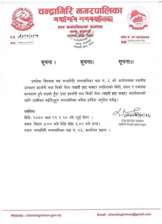 यहि माघ १९ र २० गते चन्द्रागिरि नगरपालिका- ६ चेकपोष्टमा शहरी हाटबजार सञ्चालन हुने भएको छ ।