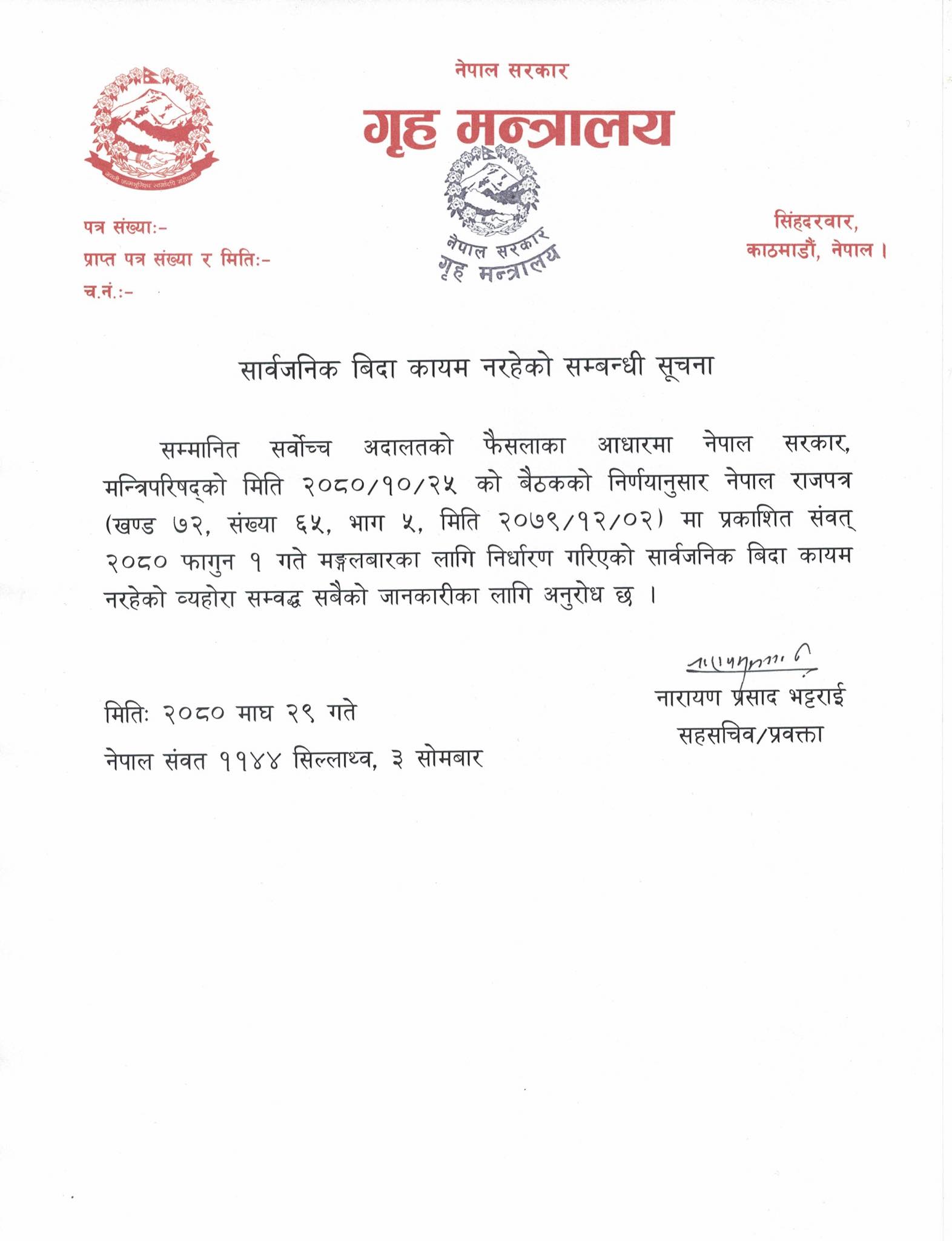 ‘सम्मानित सर्वोच्च अदालतको फैसलाका आधारमा नेपाल मन्त्रिपरिषद्को मिति २०८०-१०-२५ को बैठकको निर्णयानुसार नेपाल राजपत्र (खण्ड ७२, संख्या ६५, भाग ५ मिति २०७९-१२-०२) मा प्रकाशित संवत् २०८० फागुन १ गते मङ्गलबारका लागि निर्धारण गरिएको सार्वजनिक बिदा कायम नरहेको व्यहोरा सम्वद्ध सबैको जानकारीका लागि अनुरोध छ,’ सोमबार गृहमन्त्रालयका प्रवक्ता नारायण प्रसाद भट्टराईले जारी गरेको विज्ञप्तिमा उल्लेख छ ।