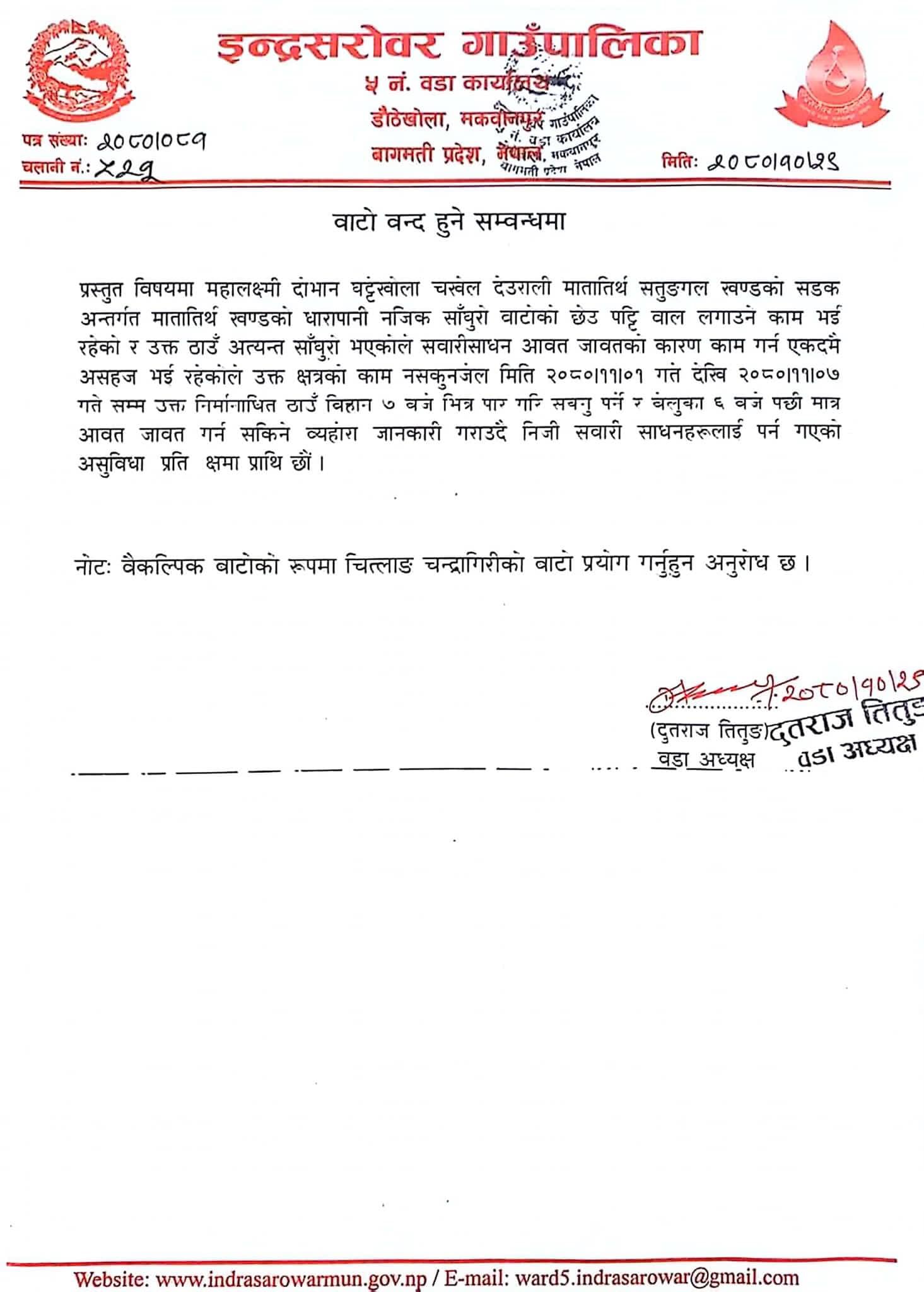 इन्द्रसरोवर गाउँपालिका ५ का वडाध्यक्ष दुतराज तितुङले सोमबार एक सूचना जारी गर्दै सो सडक खण्डमा बिहान ७ बजेसम्म र साँझ ६ बजेपछि मात्रै सवारी साधन सञ्चालन गर्न पाउने बताए ।