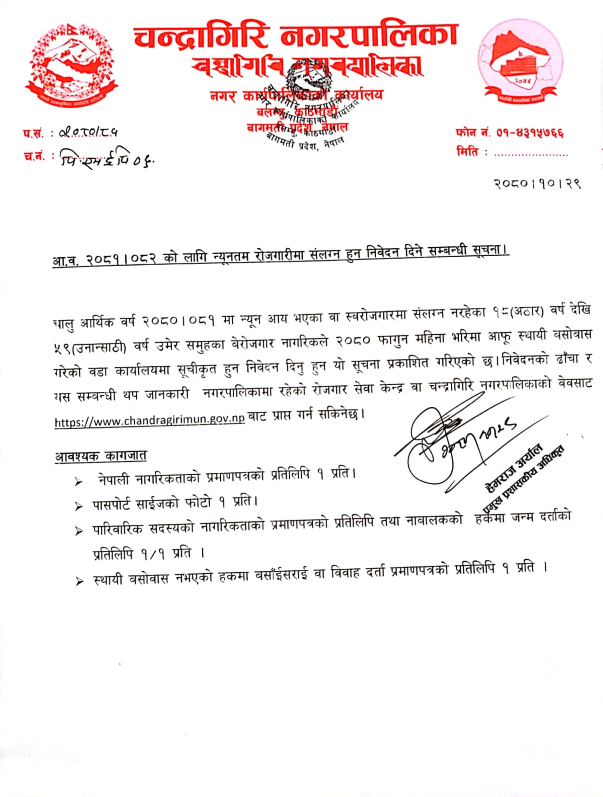 चन्द्रागिरि नगरमा न्यूनतम रोजगारमा संलग्न हुन चाहनेहरूले नेपाली नागरिकताको प्रमाणपत्रको छाँयाप्रति, पासपोर्ट साइजको फोटो,  तथा स्थायी रुपमा बसोबास गरेका कागजातका छाँयाप्रति सहित सम्बन्धित वडा कार्यालय मार्फत सूचीकृत हुन सकिने नगरपालिकाका प्रमुख प्रशासकीय अधिकृत हेमराज अर्यालले जानकारी दिनुभयो ।