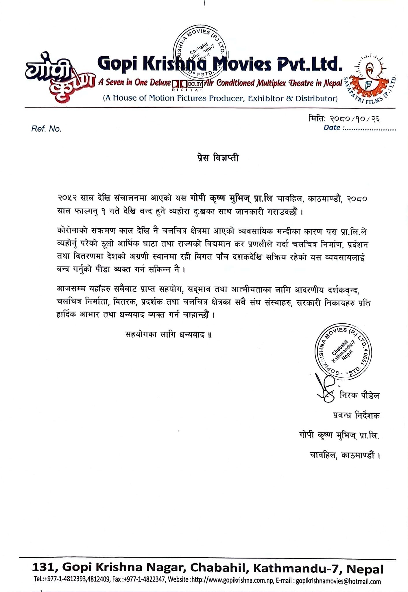 गोपीकृष्ण सिनेमा गोपीकृष्ण मुभिज प्रालिले विज्ञप्ति जारी गरी मङ्गलबारबाट गोपीकृष्ण सिनेमा हल बन्द हुने जनाएको छ ।