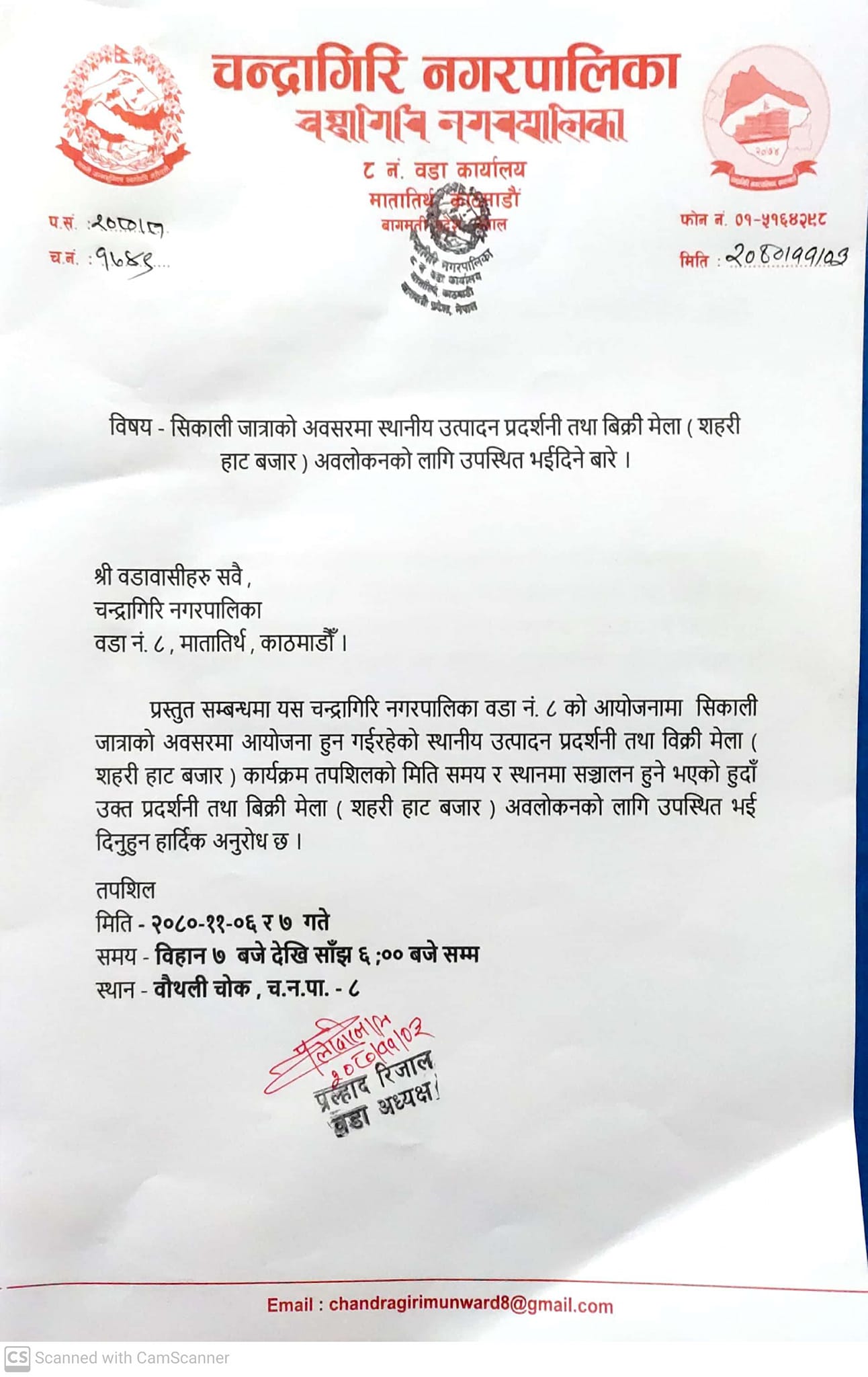 १२ वर्षे सिकाली जात्रा अवसरमा चन्द्रागिरि नगरपालिका वडा नं ८ मातातिर्थले शहरी हाट बजार सञ्चालन गर्ने भएको छ ।