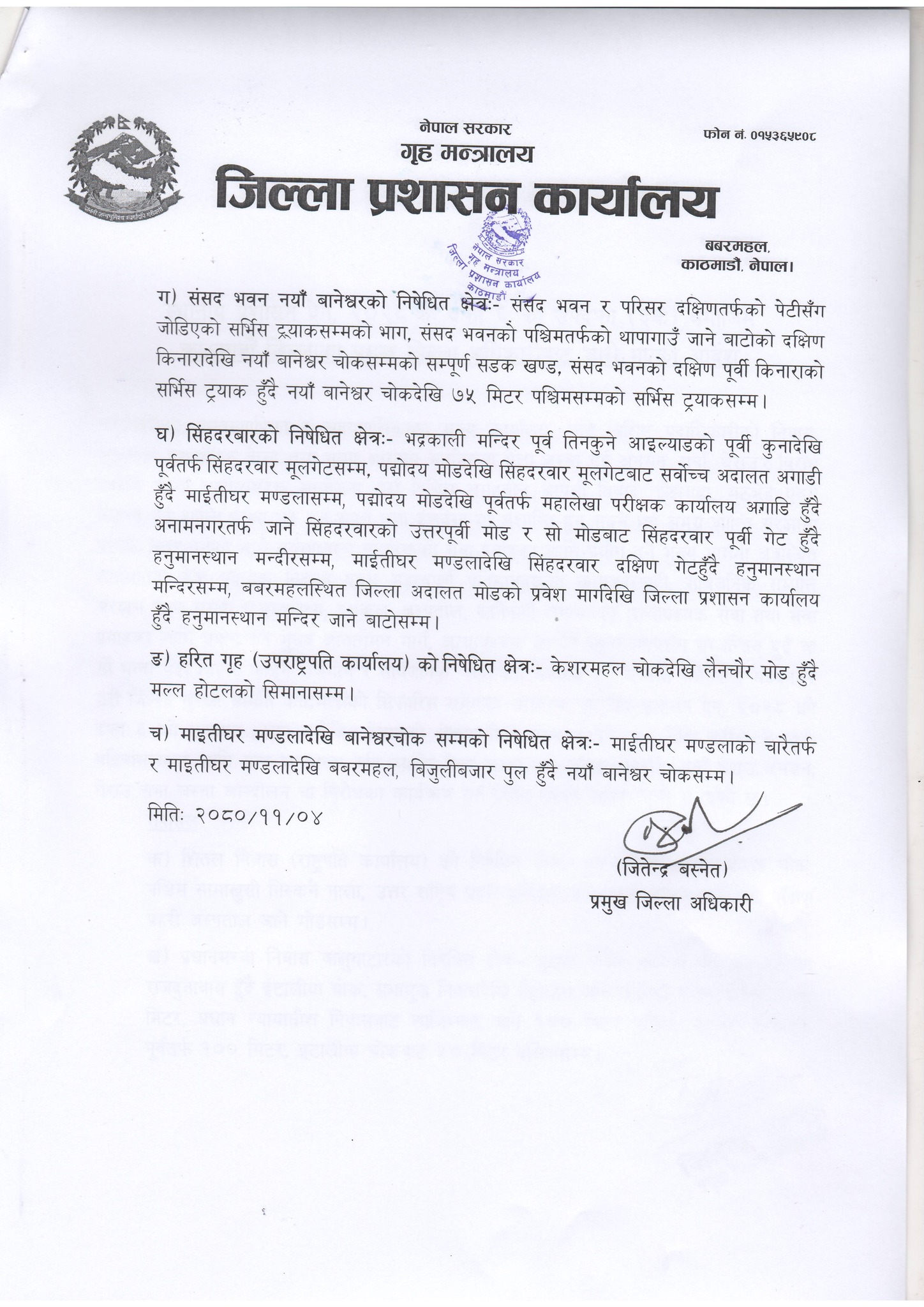 जिल्ला प्रशासन कार्यालय काठमाडौंले निषेधित क्षेत्रको समयावधि थप दुई महिना थप गरेको छ ।