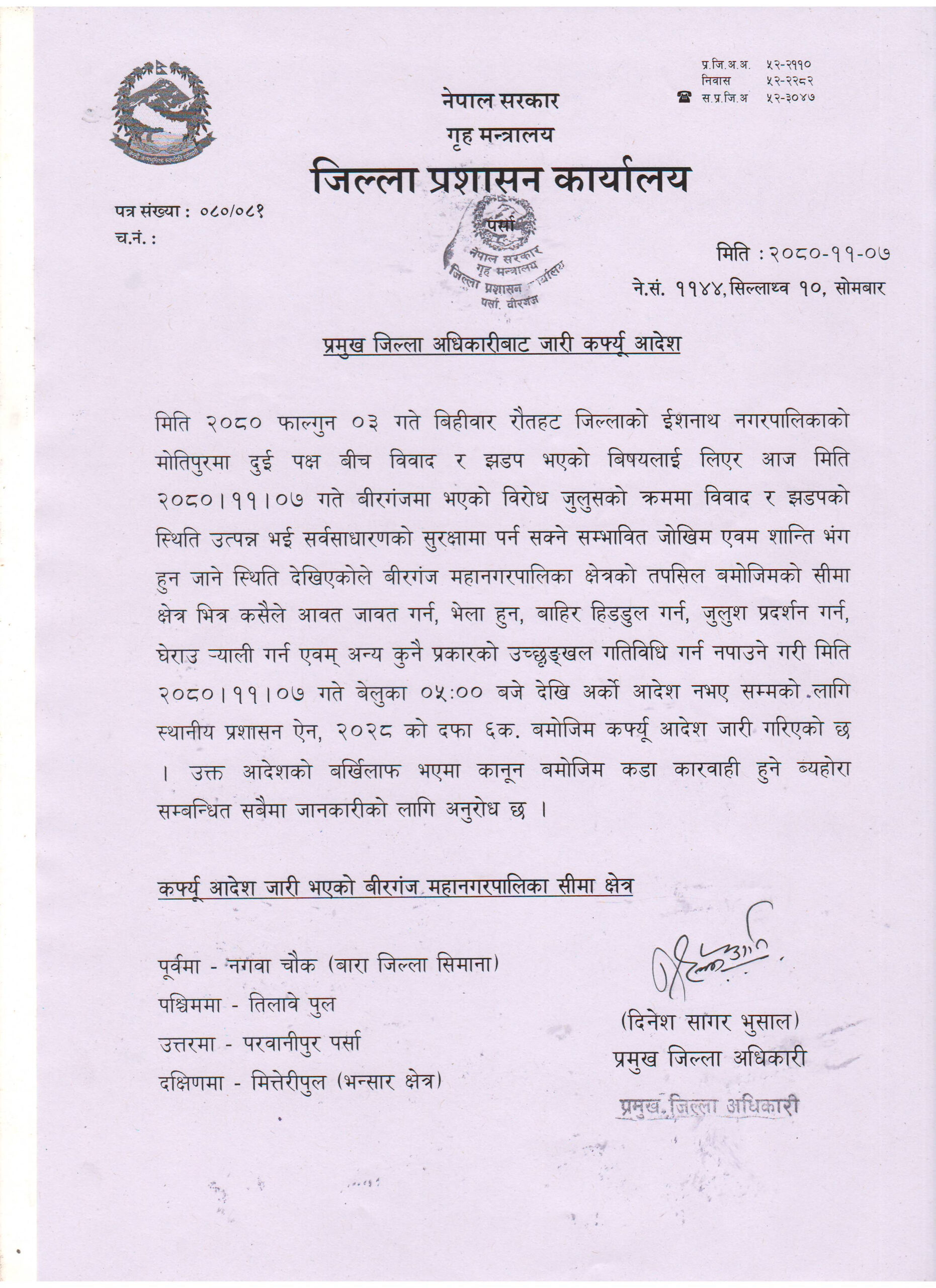 जिल्ला प्रशासन कार्यालय पर्साले वीरगञ्ज महानगरपालिकाको केही स्थानमा कर्फ्यु जारी गरेको छ ।