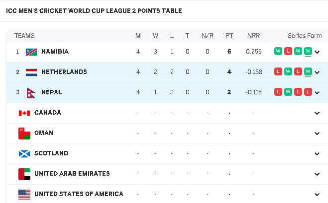 आइतबारको खेलको समाप्तिसँगै अंकतालिकामा नेपाल तेस्रो स्थानमा झरेको छ । समान ४-४ खेल खेलेका नामिबिया पहिलो तथा नेदरल्याण्ड्स दोश्रो स्थानमा रहेको छ ।