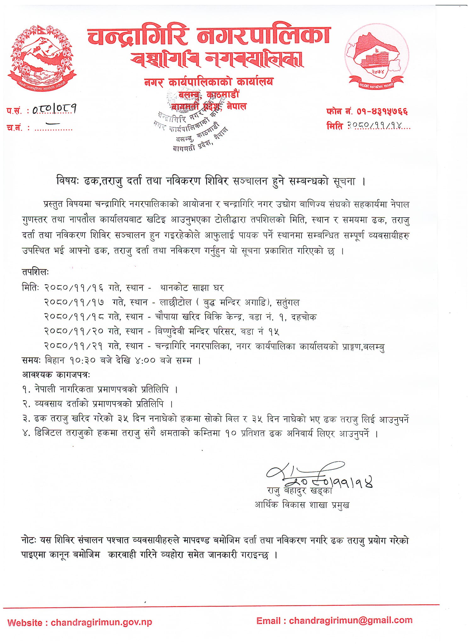 चन्द्रागिरि नगरपालिकाले चन्द्रागिरि नगर उद्योग वाणिज्य संघको सहयोगमा नगर क्षेत्रमा ढक तराजु दर्ता तथा नविकरण शिविर सञ्चालन गर्ने भएको छ ।