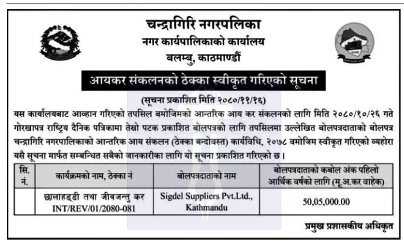 चन्द्रागिरि नगरपालिकाले २०८० साल मंसिर १२ गते छाला हड्डी तथा जीवजन्तु कर ठेक्का आह्वान गर्यो ।
