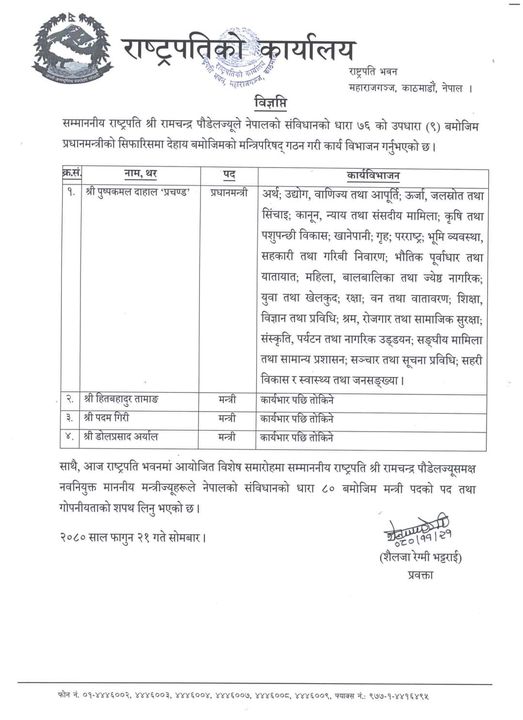 राष्ट्रपति कार्यालयका अनुसार सबै मन्त्रालयको जिम्मेवारी प्रधानमन्त्री दाहालले नै लिएका छन्।