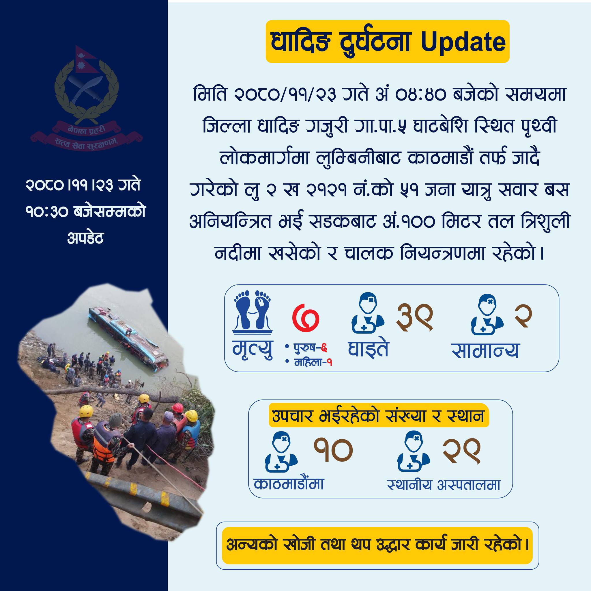 बुधबार बिहान करिब ४ः४० बजे रूपन्देहीबाट काठमाडौं आउँदै गरेको सिद्धार्थ यातायातको लु. २ ख. २१२१ नम्बरको यात्रु बस पृथ्वी राजमार्ग अन्तर्गत धादिङको गजुरी गाउँपालिका-५ घाटबेंशीमा सडकबाट त्रिशुली नदीमा खस्दा ३९ जना घाइते भएका छन् ।