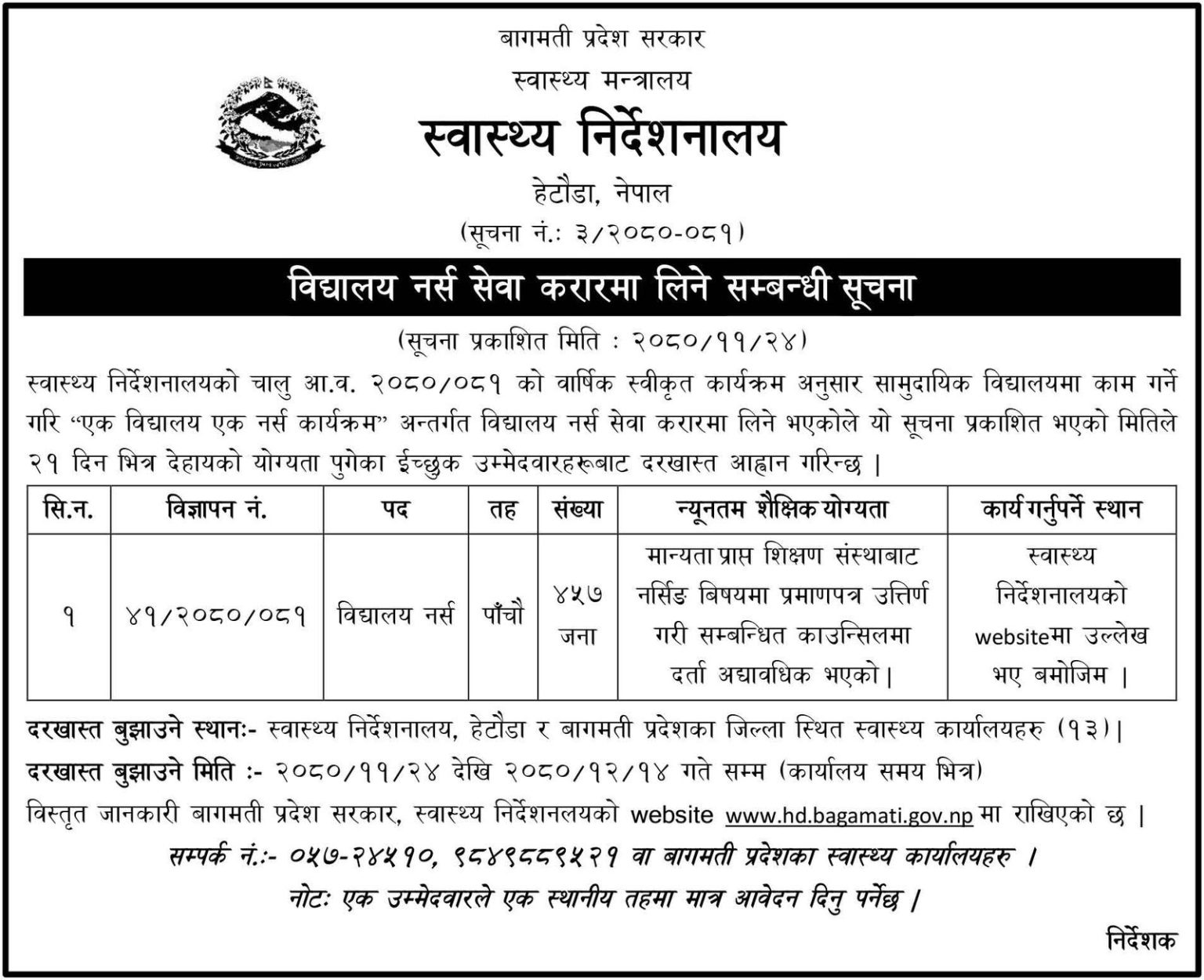 बागमती प्रदेशको स्वास्थ्य निर्देशनालय हेटौंडाले ४ सय ५७ जना नर्सका लागि आवेदन माग गरेको छ ।