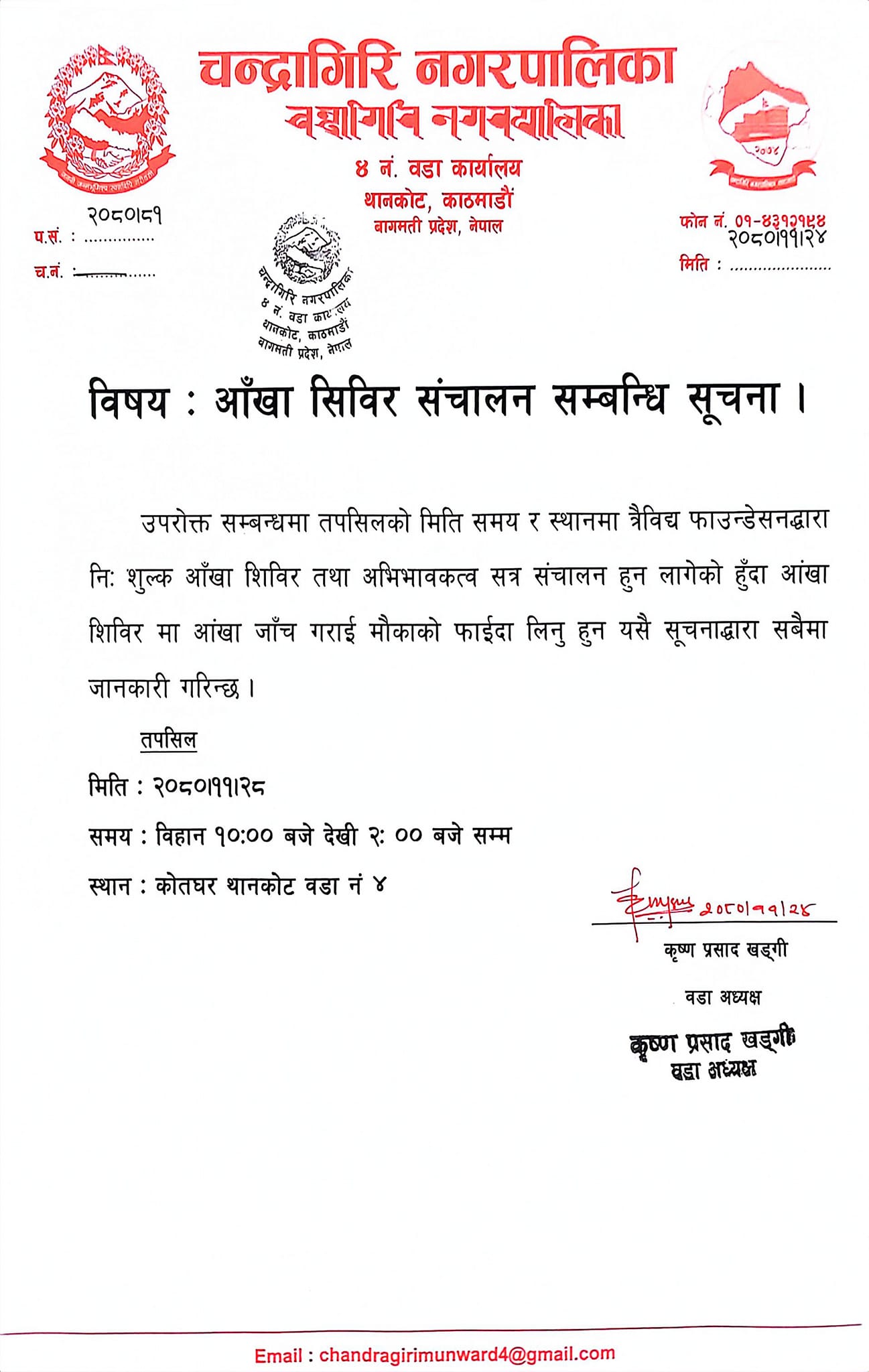 त्रैविद्य फाउण्डेशनको आयोजनामा आज सोमबार चन्द्रागिरि नगरपालिका-०४ थानकोटमा एक दिने निःशुल्क आँखा शिविर सञ्चालन हुने भएको छ ।