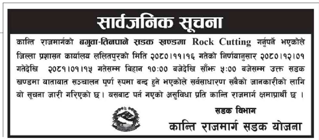 ललितपुरका प्रमुख जिल्ला अधिकारी तुलसीबहादुर श्रेष्ठको अध्यक्षतामा फागुन १६ गते बसेको बैठकले सो सडक मार्गको काल्चे खण्डमा पर्ने चेनेज कटिङसहितको निर्माण गर्न बिहान १० बजेदेखि बेलुकी ५ बजेसम्म सवारी आवत जावतमा रोक लगाउने निर्णय गरेको थियो ।