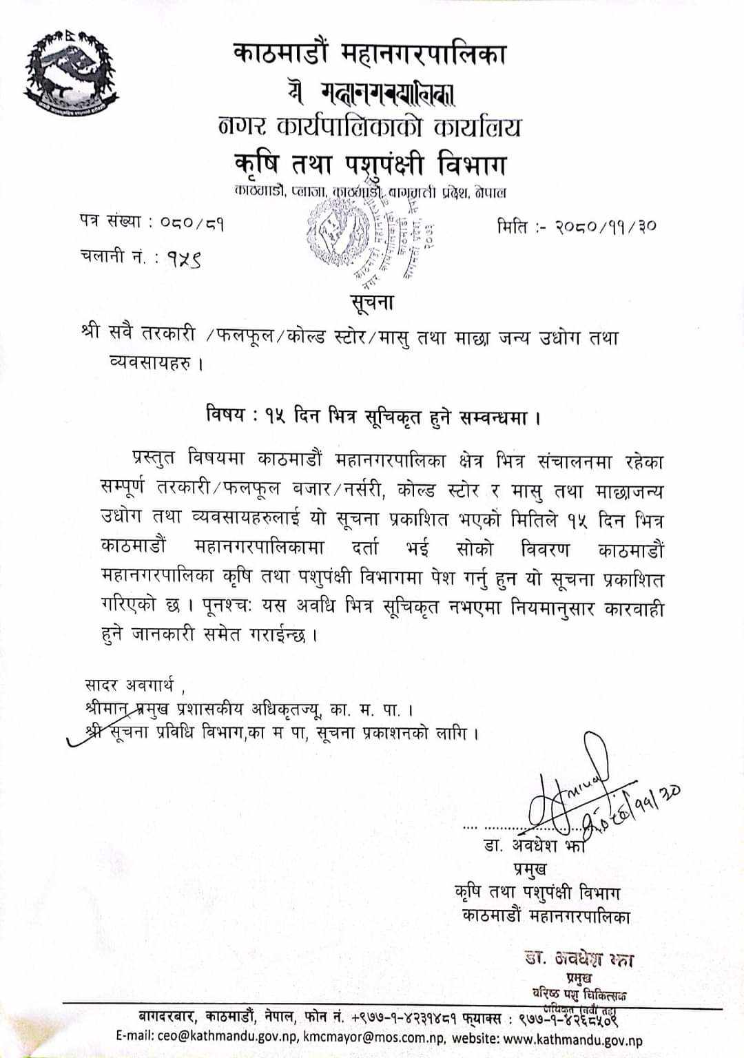 काठमाडौँ महानगरपालिकाले नगरक्षेत्र भित्र सञ्चालनमा रहेका तरकारी, फलफूल बजार, नर्सरी, कोल्ड स्टोर र मासु तथा माछाजन्य उद्योग तथा व्यवसायलाई १५ दिन दर्ता गर्न निर्देशन दिएको छ ।