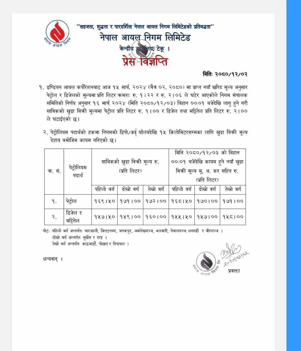 नयाँ मूल्य शनिबार बिहान १ बजेदेखि लागू हुने निगमले जानकारी दिएको छ ।