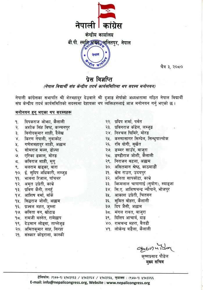 नेपाली कांग्रेसले शनिबार विज्ञप्ति जारी गर्दै सभापति देउवाले विभिन्न जिल्लाका ४१ जनालाई नेविसंघको केन्द्रीय सदस्य मनोनीत गरेका जानकारी दिएको हो।