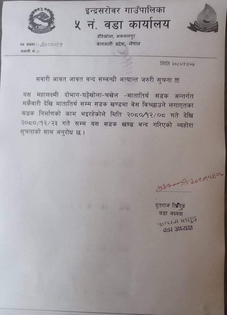 इन्द्रसरोवर गाउँपालिका वडा नं. ५ का वडाध्यक्ष दुतराज तितुङले सो सडकमा चैत्र ८ गतेबाट २३ गतेसम्म सवारी साधनको सञ्चालन बन्द गर्ने निर्णय भएको जानकारी दिए ।
