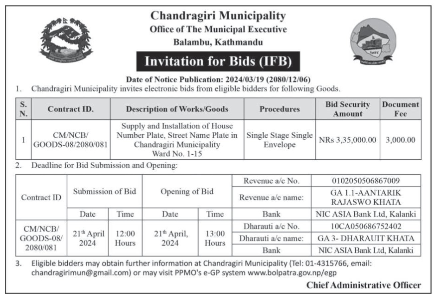 चन्द्रागिरि नगरपालिकाले १५ वटै वडामा रहेका घर तथा सडक/गल्लीहरूमा डिजिटल नम्बर प्लेट राख्नका लागि सार्वजनिक टेण्डर नै आह्वान गरेको छ ।