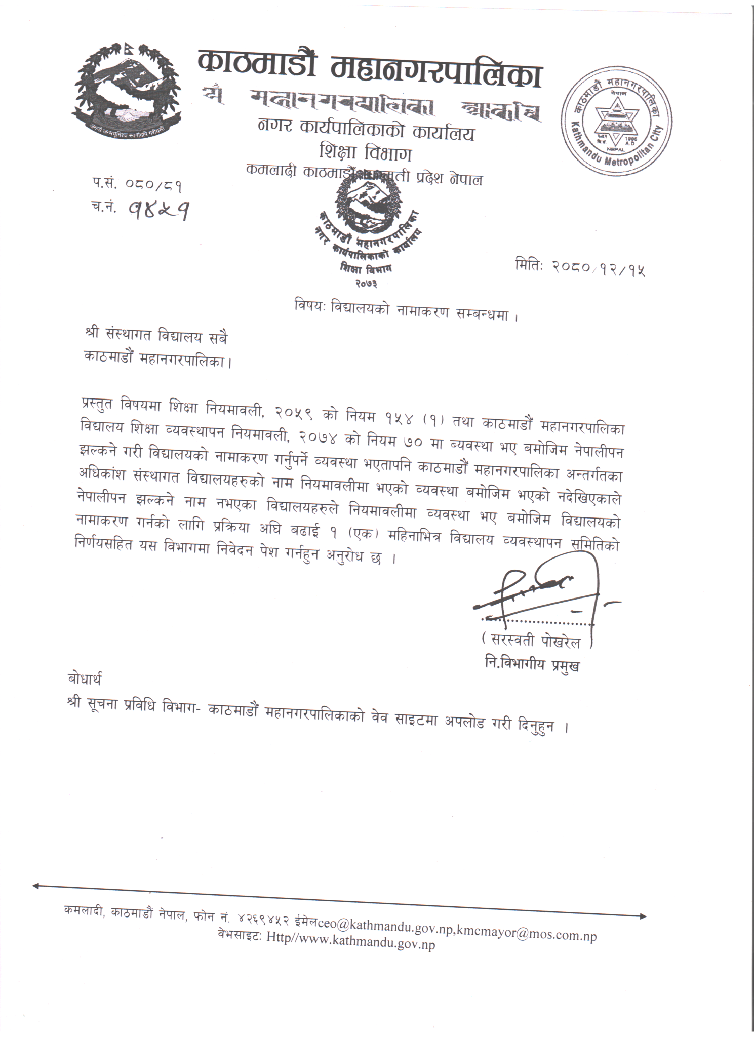 महानगरभित्र सञ्चालित नेपालीपन झल्कने नाम नभएका निजी विद्यालयलाई एक महिनाभित्रमा नाम परिवर्तन गरी विद्यालय व्यवस्थापन समितिको निर्णयसहित महानगरको शिक्षा विभागमा निवेदन पेस गर्न महानगरले सूचना जारी गरेको हो ।