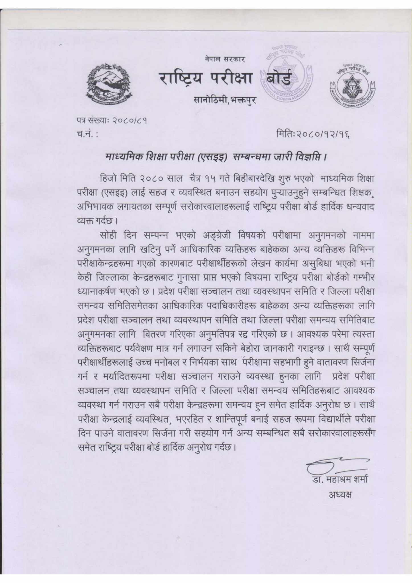 आवश्यक परेमा त्यस्ता व्यक्तिहरूबाट पर्यवेक्षण मात्र गर्न लगाउन सकिने बोर्डले जनाएको छ । साथै परीक्षा केन्द्रलाई व्यवस्थित, भएरहित र शान्तिपूर्ण बनाई सहज रूपमा विद्यार्थीले परीक्षा दिन पाउने वातावरण सिर्जना गरी सहयोग गर्न अन्य सम्बन्धित सबै सरोकारवालाहरूसँग समेत बोर्डले अनुरोध गरेको छ ।