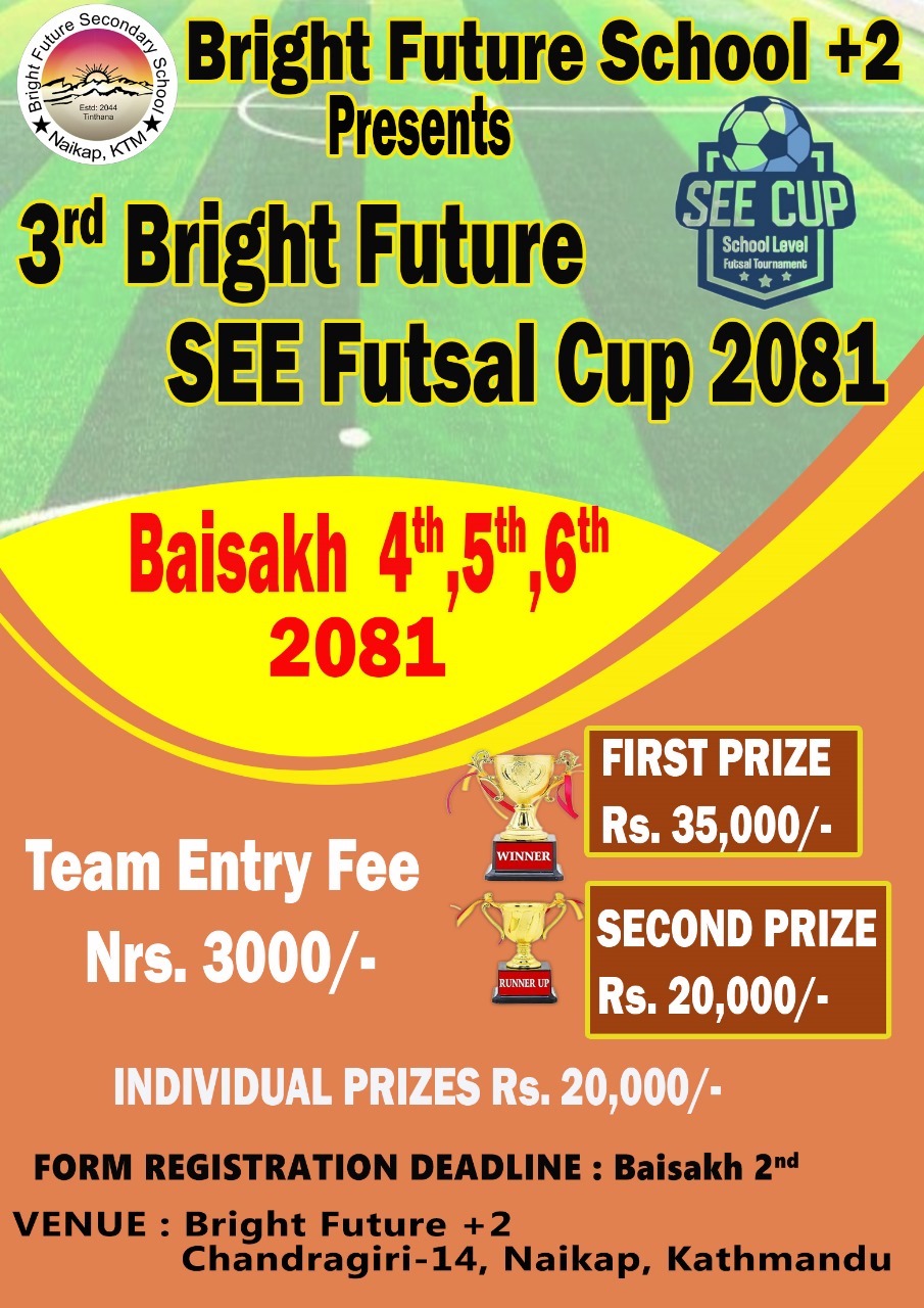 तेस्रो ब्राइट फ्यूचर एसइइ कप फुटसल प्रतियोगिता २०८१ साल बैशाख ४ गतेदेखि सुरु हुने भएको छ ।