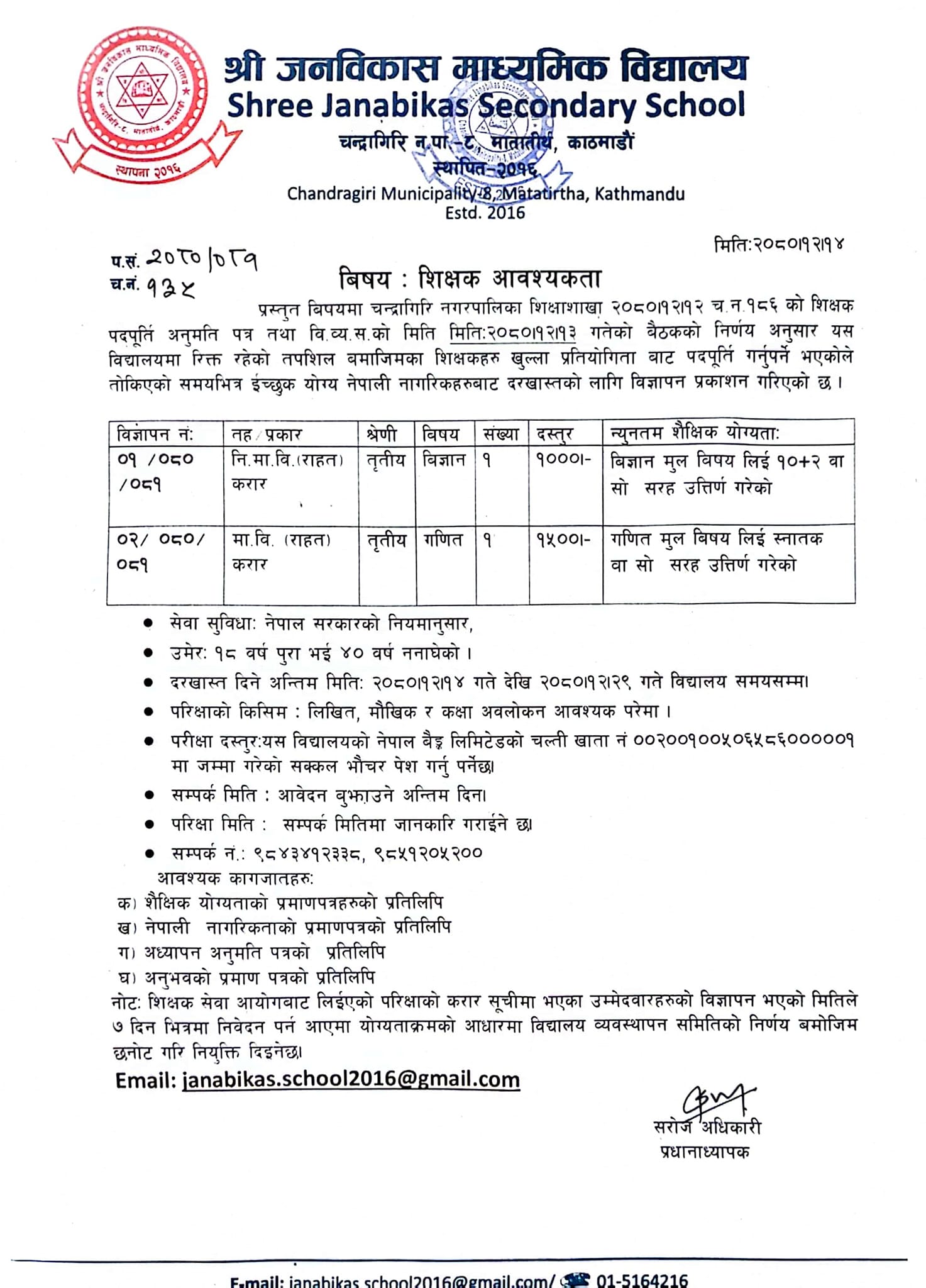 चन्द्रागिरि नगरपालिका-०८ मातातिर्थस्थित जनविकास माविले करार सेवामा दुई जना शिक्षक माग गरेको छ ।